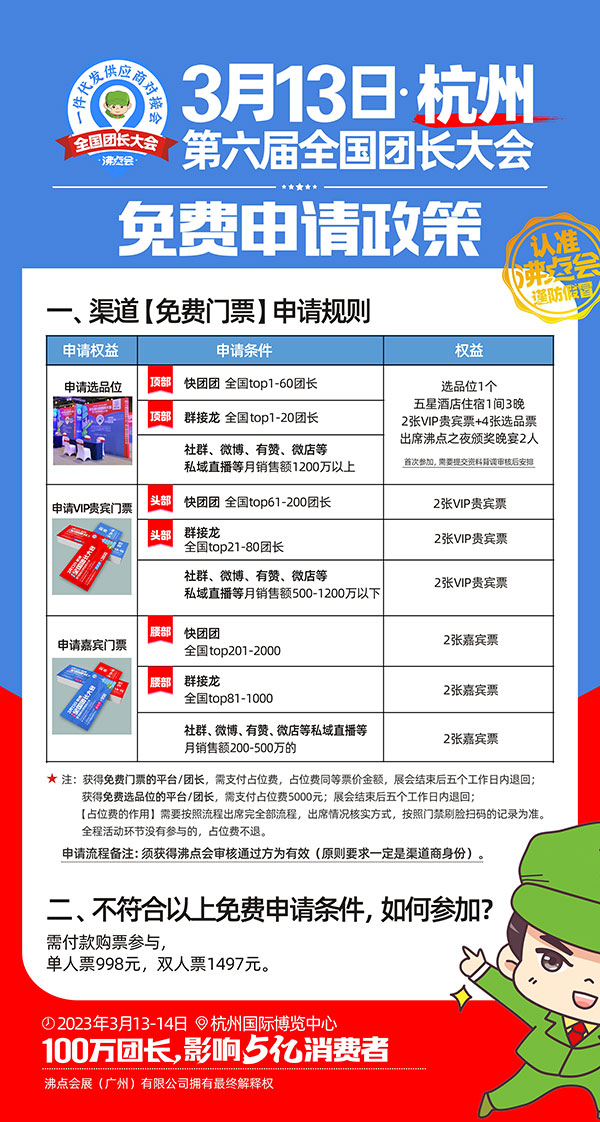 2023年沸点会排期:全国团长大会(第六届)3月13-14日在杭州国际博览中心,全国团长大会(第七届)8月8-9日在广州保利世贸博览馆举办,敬请关注。